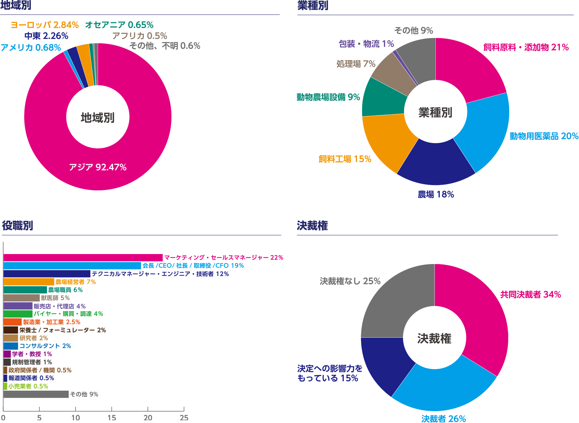 日本を含め世界中から約1,500社の設備・材料メーカー・商社が出展し、世界のグローバル企業や重要性の高まるアジアの畜産・水産プレイヤーを含むユニークな企業で構成されています。