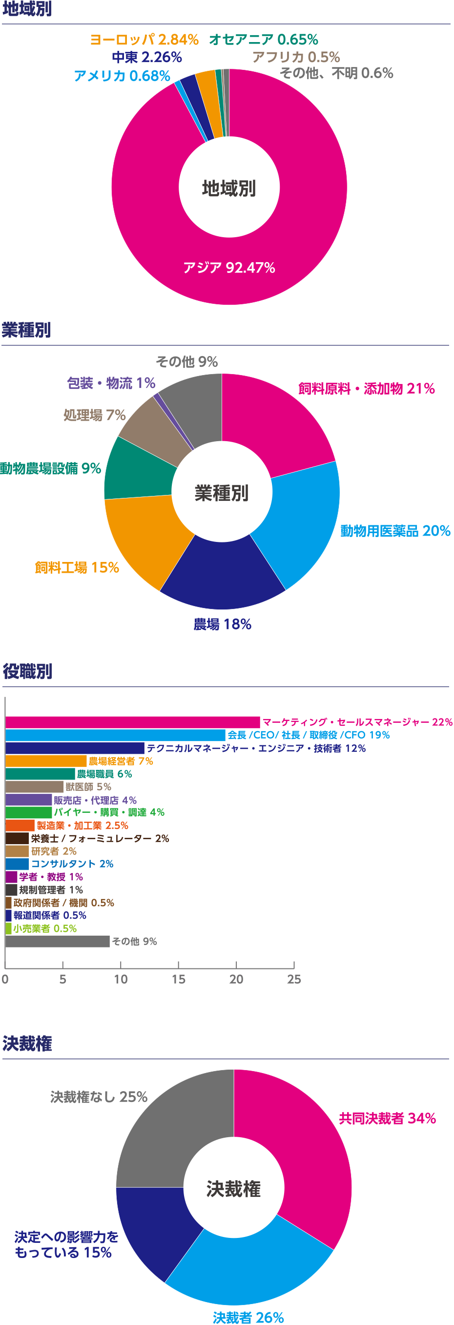 日本を含め世界中から約1,500社の設備・材料メーカー・商社が出展し、世界のグローバル企業や重要性の高まるアジアの畜産・水産プレイヤーを含むユニークな企業で構成されています。